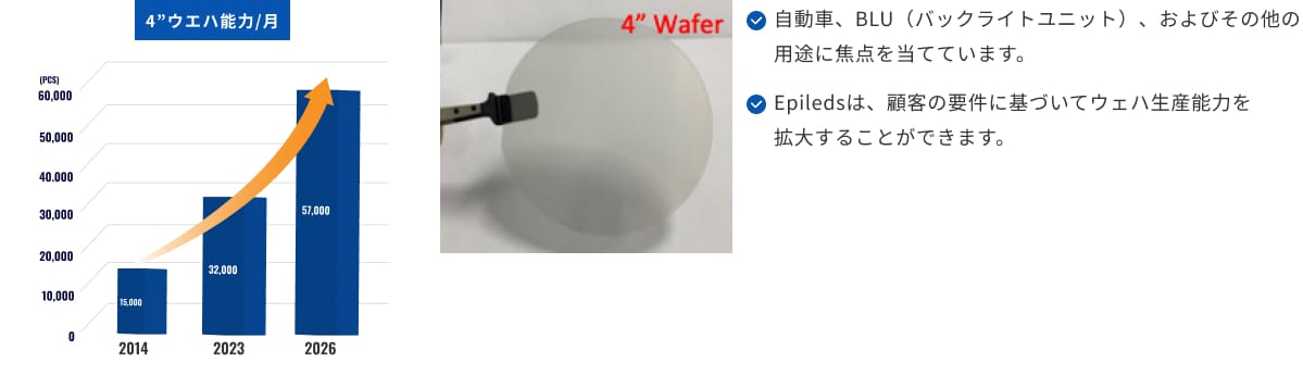 エピタキシー、基板転送、ウェーハー処理技術を使用することで、265nm〜1650nmの異なる構造のLEDを製造することができます。