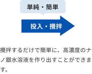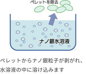 物質間力のみでナノ銀を担持させたペレットを水などの溶液に浸した状態で攪拌することで、ナノ銀をペレットから引き剥がします。剥がれたナノ銀が溶液内に拡散することで、容易にナノ銀水溶液を作ることができるのです。