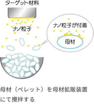 薄膜蒸着の初期核形成理論を利用し、粉末状、粒状固形物、あるいは条件下の液体を母材として(スパッタリング可能な)金属、セラミック、合金のナノ状微細粒子等を物質間力のみで担持させ安定複合材料を形成する独自の技術工法は、 Nano Target on Carrierの頭文字を取ってNTOC工法とし、特許を取得しています。(特許JPB005802811)